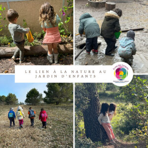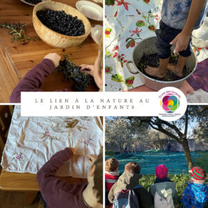 Dès le plus jeune âge, le contact avec la nature est entretenu par différentes activités. Chaque semaine, les élèves du Jardin d’Enfants passent une demi-journée à la colline Ste Anne de Vedène où l’école se fait en extérieur. Au cours de l’année, des sorties sont également prévues au Jardin de Brantes pour des activités autour de la laine, des teintures naturelles.